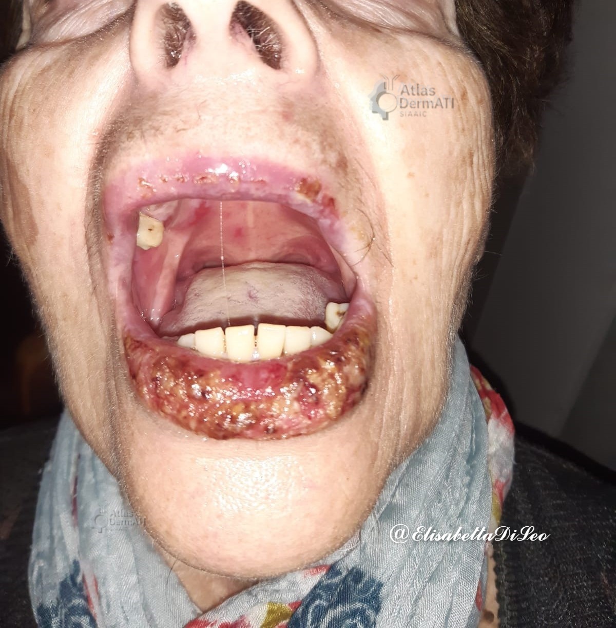 Pemfigo volgare (Dosaggio di anticorpi Anti-Desmogleina 3: 2800,00 RU/ml; v.n: < 20,00 RU/ml metodo ELISA). Presenza di infezione da Candida sovrapposta a livello della superficie dorsale della lingua.